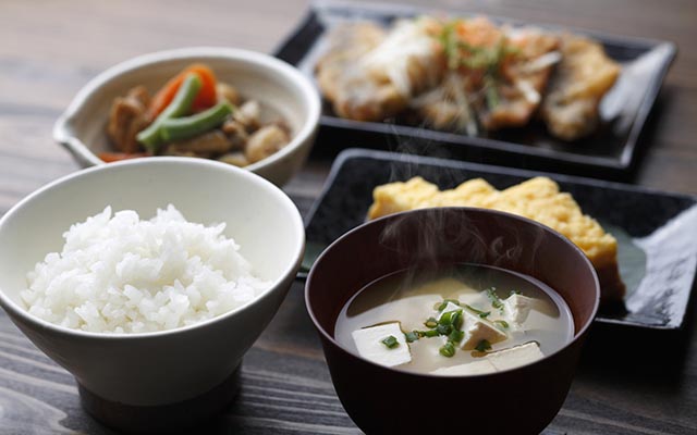 白米を主食に野菜等の食物繊維を2品、タンパク質を多く含む肉、魚、卵、大豆製品などの主菜を一品、そして汁物を一品。